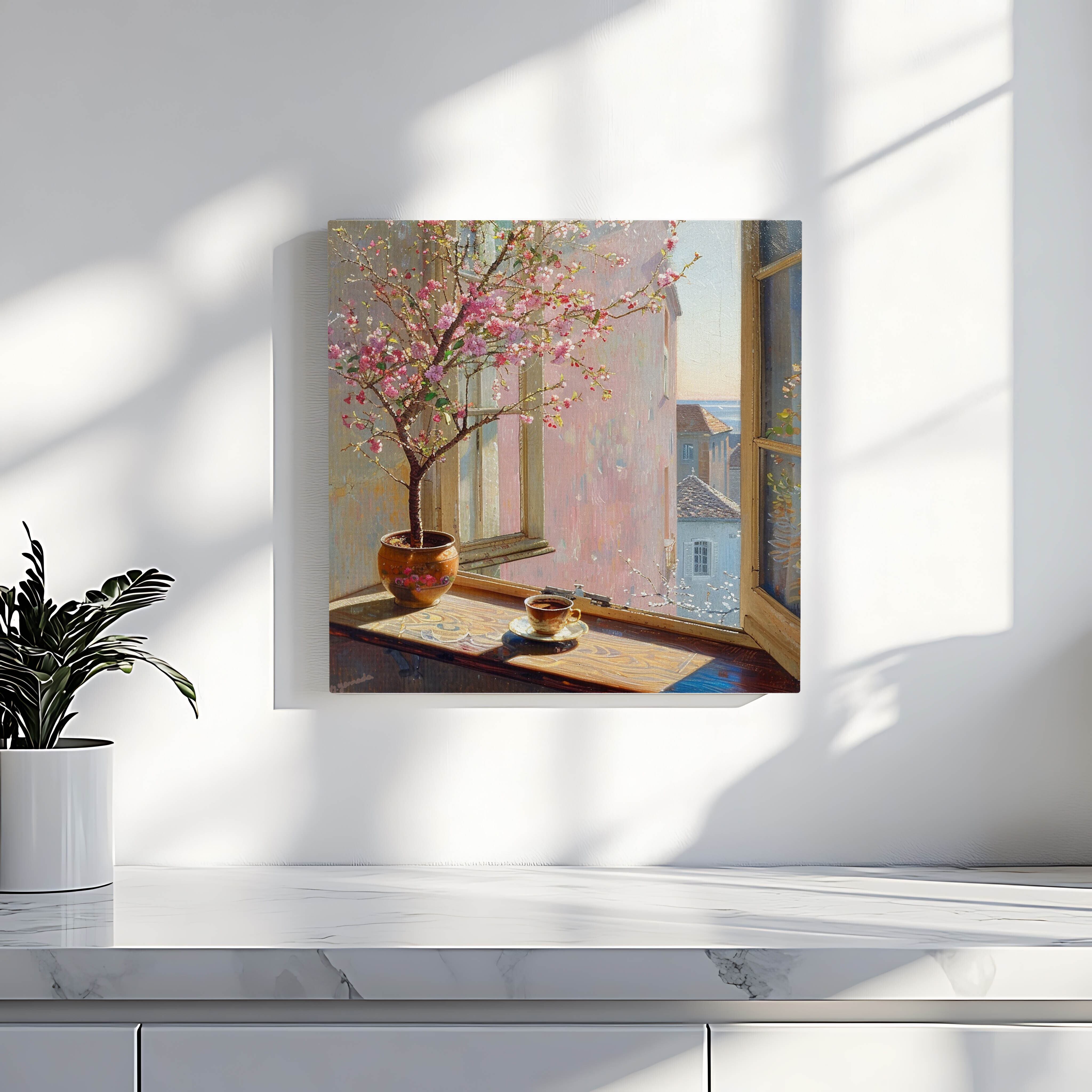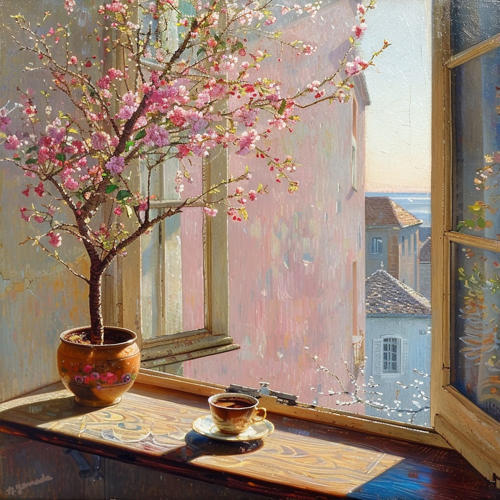 鉢植えの桜が、小さな花をほころばせる春の朝。
