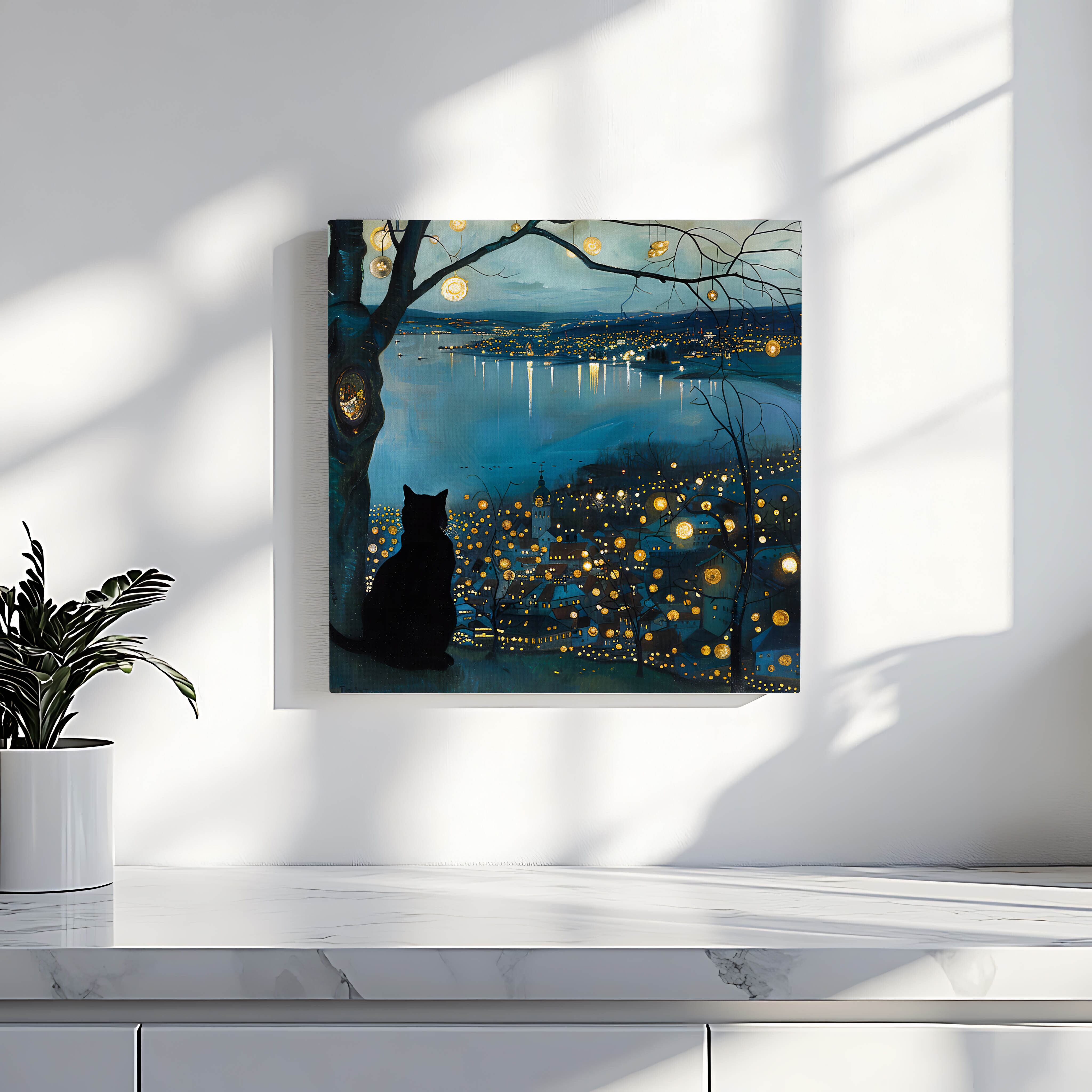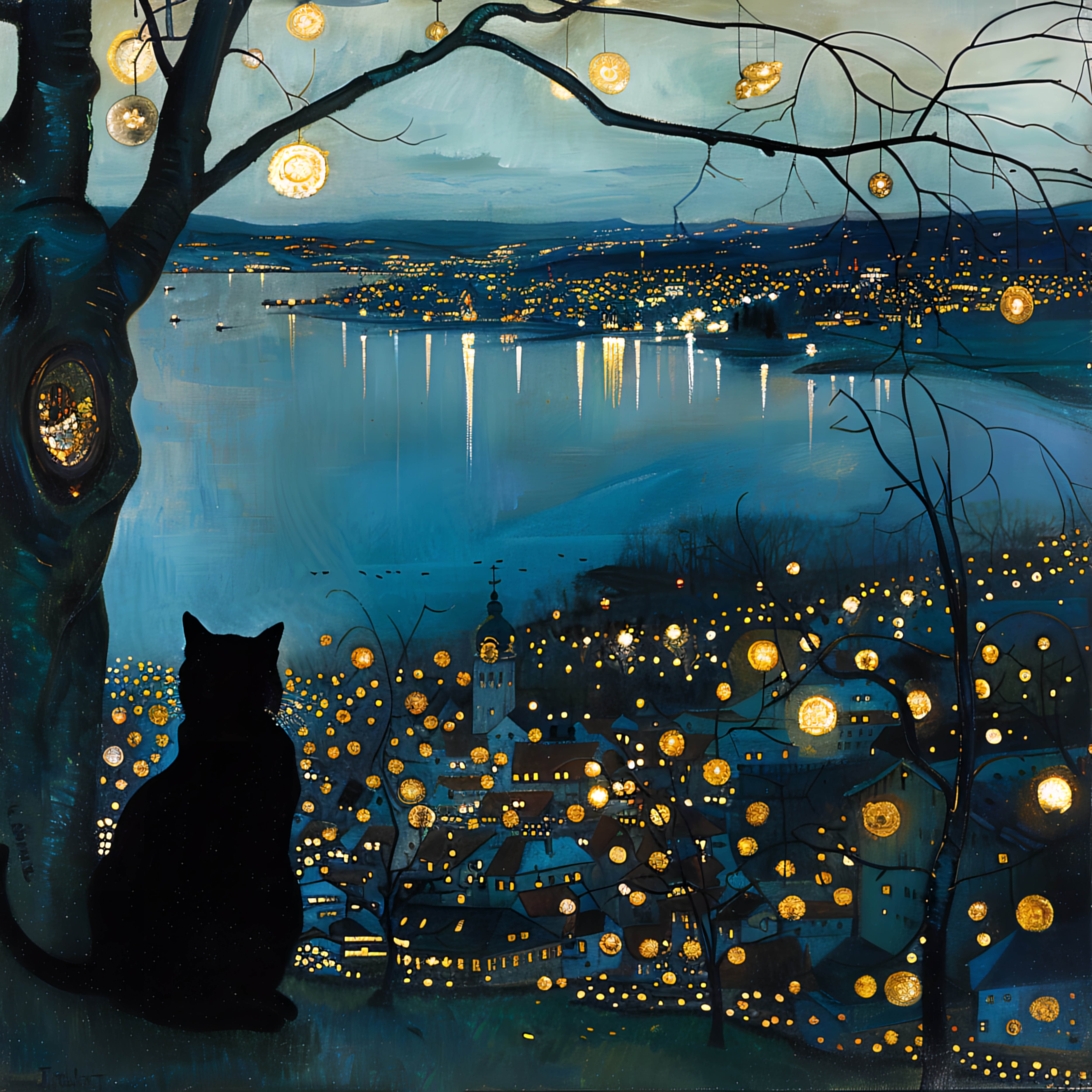 街の灯り、川に映る光、そして静かに見つめる黒猫。
