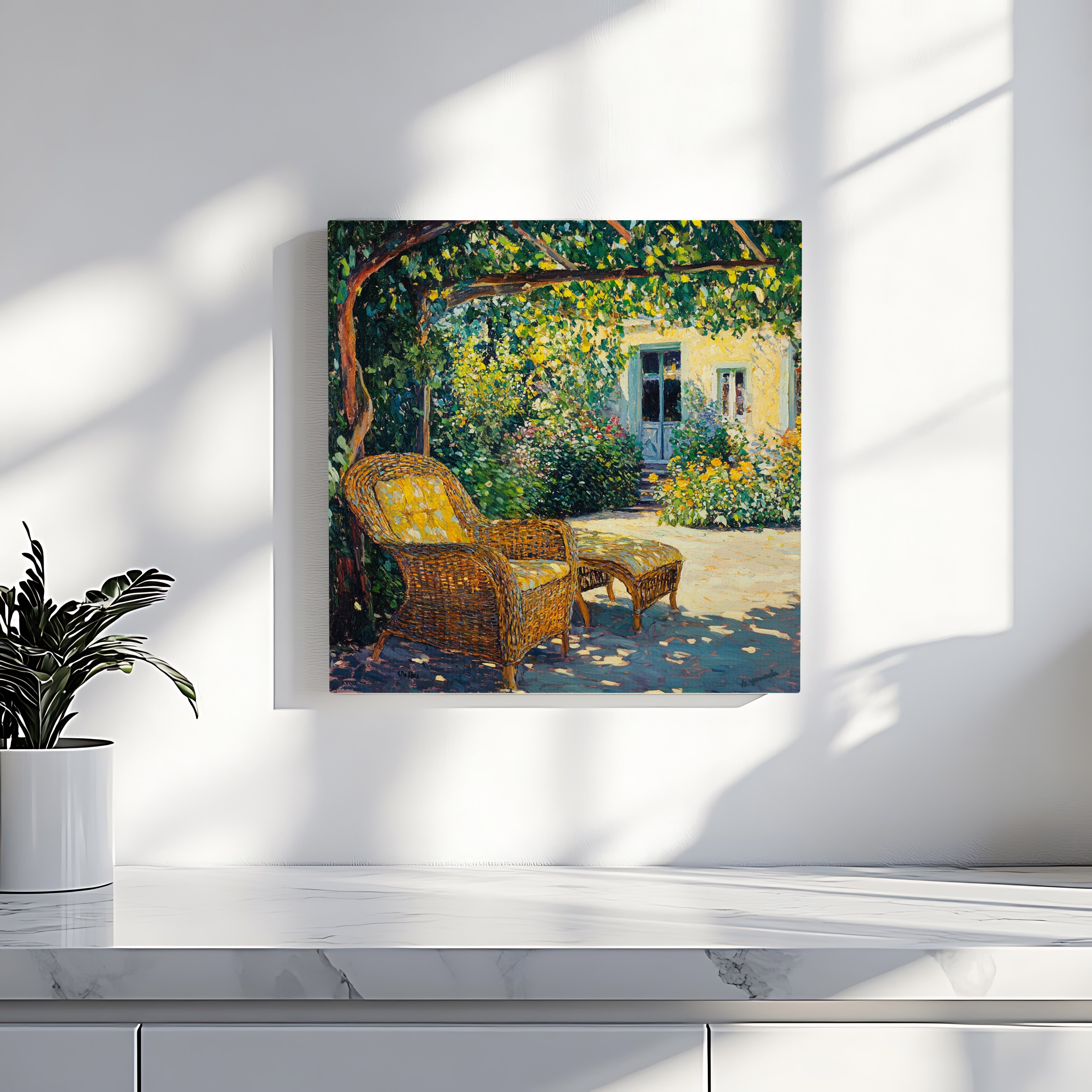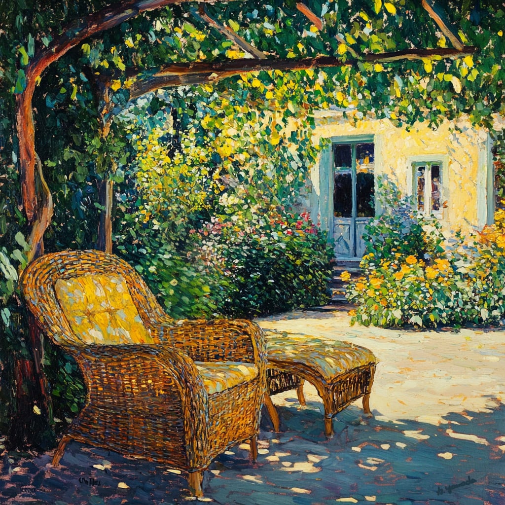 降り注ぐ日差しをやさしく遮る木陰に佇むラタンの椅子。まるで「ここでは何もせず、ただ寛いで」と囁きかけるようです。過ぎゆく時間を忘れ、心ゆくまで静寂を味わえる――そんな至福のひとときを描きました。