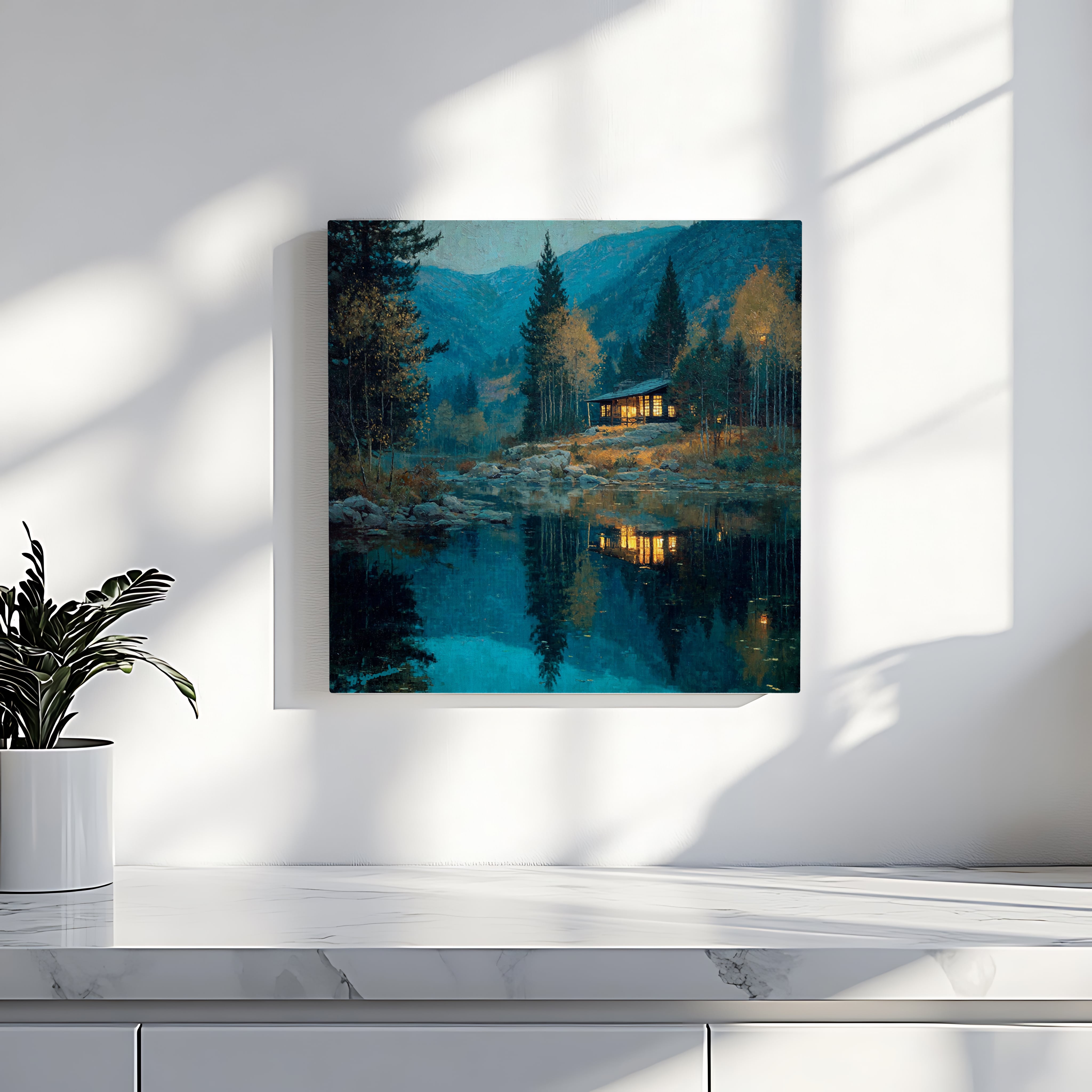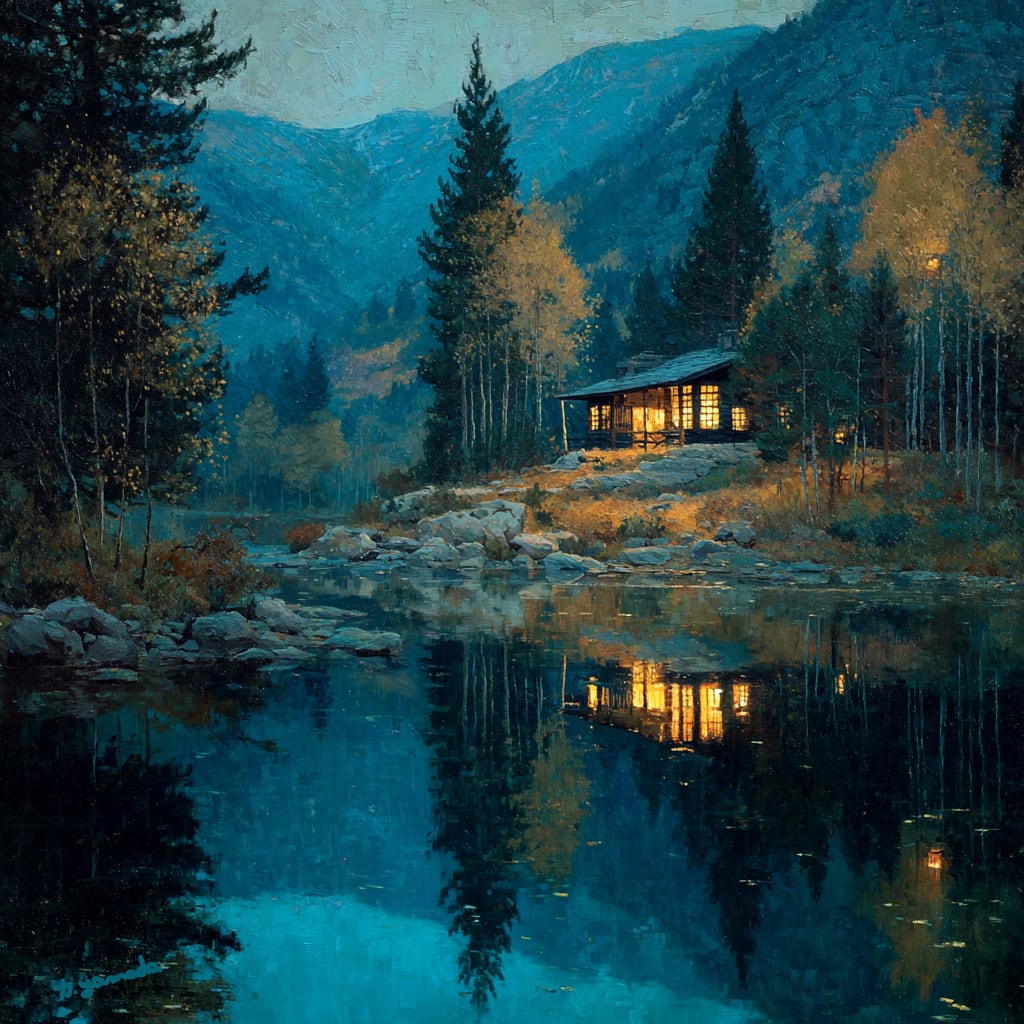 人が自然の中にそっと溶け込むような、安らぎの避難所を描いた一枚です。