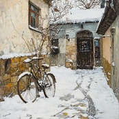 石壁に立てかけられた自転車に、静かに雪が降り積もります。