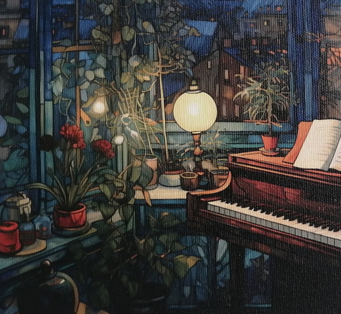冷たい青のトーンと点在する暖かな光が、時間の止まったような空気感を生み出しています。