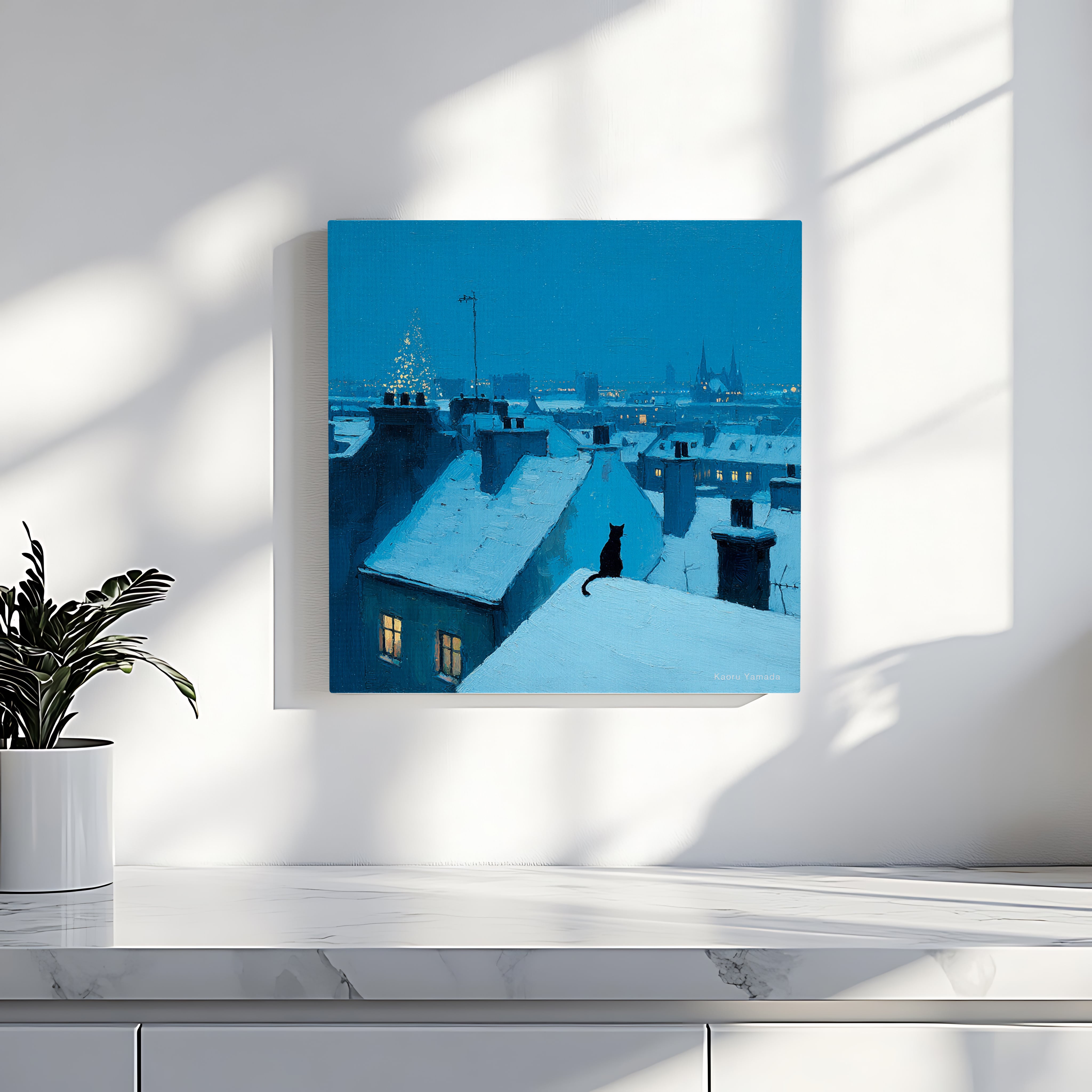 雪に覆われた屋根の上で、一匹の猫が夜の街の灯りを静かに見つめています。